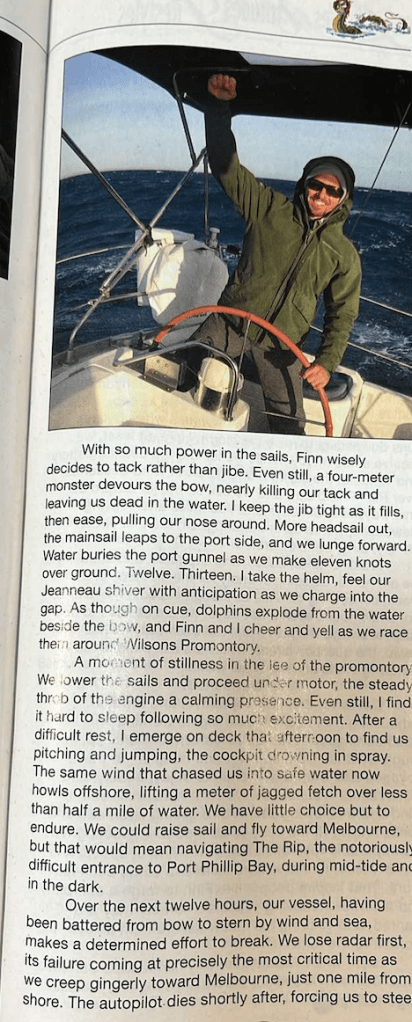 Over the next twelve hours, our vessel, having been battered from bow to stern by wind and sea, makes a determined effort to break. We lose radar first, its failure coming at precisely the most critical time as we creep gingerly toward Melbourne, just one mile from shore. The autopilot dies shortly after, forcing us to steer the last twenty-four hours by hand. In the early hours of next morning, despite multiple attempts to coax it to life, the generator joins the autopilot. Finally, after safely navigating The Rip at dawn and on slack-tide, the house-battery bank unleashes clouds of hydrogen sulphide into the saloon. I’m three-quarters asleep, unknowingly breathing the toxic fumes when Dylan runs downstairs to raise the alarm. Here, at least, we receive some mercy. While we isolate the cooked battery and ventilate the saloon, a brief spurt of wind descends over Port Phillip Bay, and we sail on the jib toward our final waypoint. Six days and 700 miles after leaving Newcastle, we tie up in Sandringham Marina. Tired, hungry, dirty, but exhilarated.